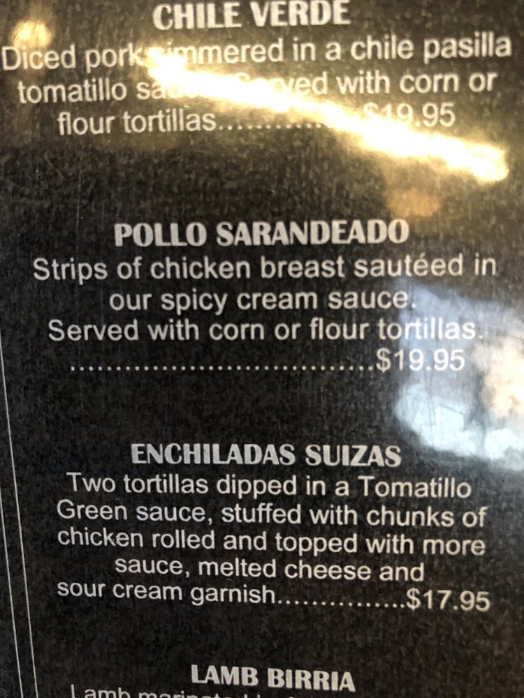 Prepared in a traditional Mexican manner, strips of marinated broiled steak, served on soft doubled corn tortillas, with sliced avocados and pico de gallo. Choose a beans: Refried Bean, Charro Bean, Black Bean. Choose a side: Soup, Salad.
