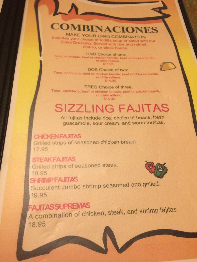Taco, enchilada, beef or chicken tamale, beef or chicken burrito or chile relleno. Choose an item: Taco, Enchilada, Beef Tamale, Chicken Tamale, Beef Burrito. Choose a tortilla: Corn Tortilla, Flour Tortilla. Choose a beans: Refried Bean, Charro Bean, Black Bean. Choose a side: Soup, Salad.